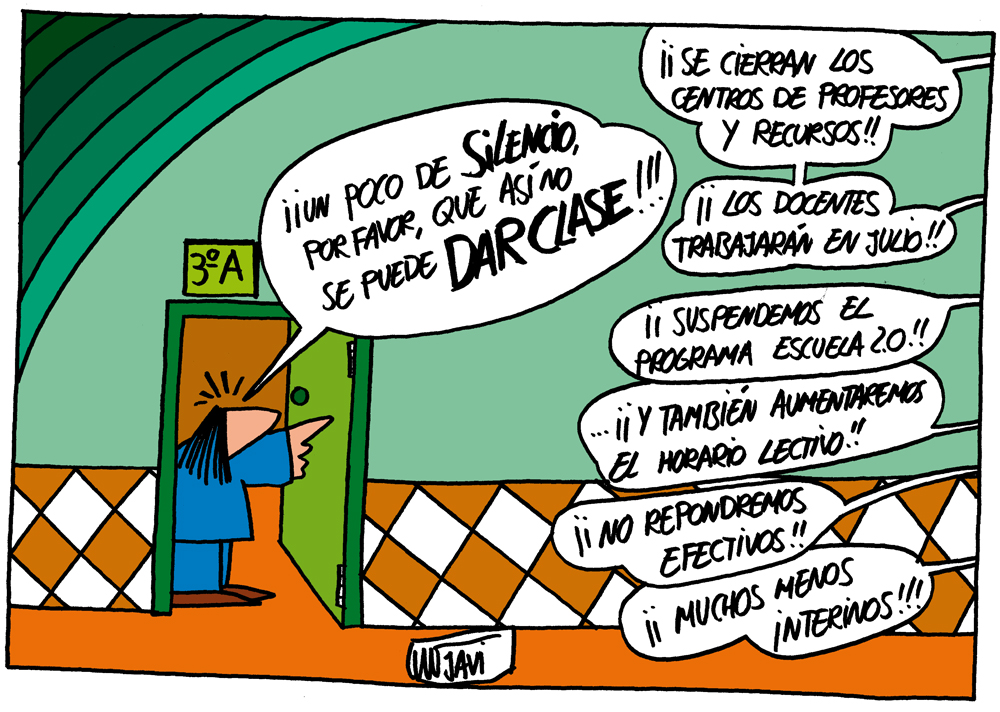 Dice el Telediario que estos tajos deben hacerse de arriba abajo y limpiamente. No es conveniente que se discutan en las mesas de negociación con los representantes del profesorado, no es razonable que tengan excepciones ni que contemplen la realidad de las aulas. No tiene importancia la destrucción de tres décadas de trabajo - a lo mejor poco lucido pero muy serio - por la mejora de las condiciones del profesorado y la atención a los alumnos más desfavorecidos.