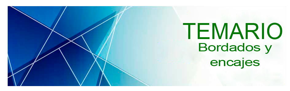 - Arte e industria del bordado y encaje. El encaje y el bordado industrial, nuevas tecnologías. Aplicaciones y tendencias actuales del bordado y encaje, su relación con la moda. Normativa y normalización en la presentación y comercialización de los productos.