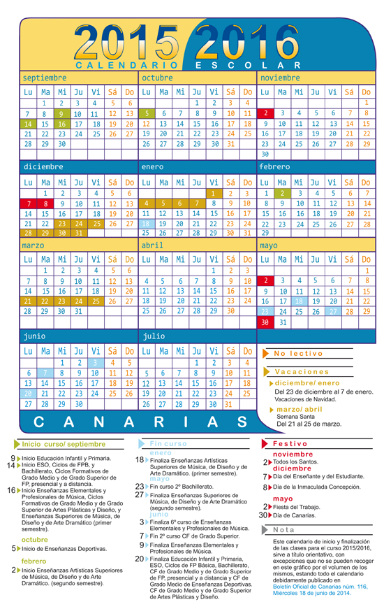 Resolución de 1 de junio de 2015, por la que se establece el calendario escolar y se dictan instrucciones para la organización y desarrollo de las actividades de comienzo y finalización del curso 2015/2016, para los centros de enseñanzas no universitarias de la Comunidad Autónoma de Canarias.