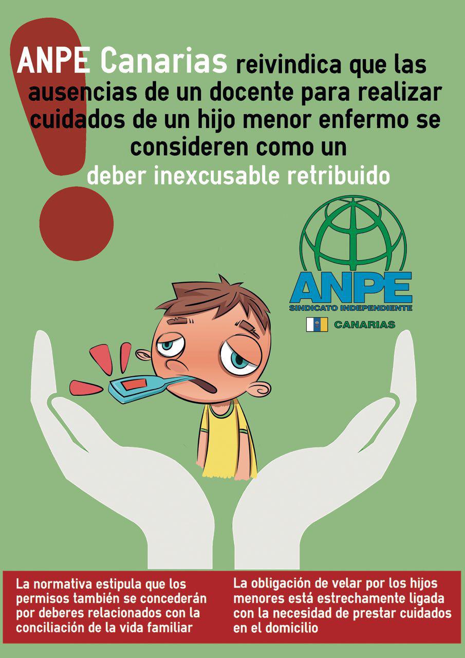 ANPE Canarias entiende que las ausencias del profesorado motivadas por proporcionar cuidados domiciliarios a sus hijos e hijas menores que se encuentren enfermos, siempre que estén debidamente acreditadas mediante certificado médico, tienen que considerarse siempre como el cumplimiento de un deber inexcusable y no como un suceso imprevisto que atender.