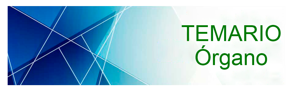 - Historia general del órgano: Orígenes y antecedentes del órgano. Evolución a través de la historia. Diferencias entre las diversas escuelas de construcción organística en Europa. Descripción general de las características constructivas. Configuración del teclado y el pedalero. Uso de los acoplamientos. Mantenimiento y conservación.