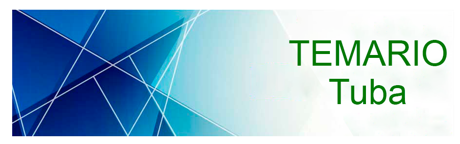 - La tuba moderna: descripción de sus características constructivas. Mantenimiento y conservación. Aspectos fundamentales en la elección del instrumento. Instrucciones básicas sobre montaje y conservación. Utilización de las boquillas en los diferentes tipos de tuba. Diferentes tipos de tuba: Características constructivas y de sonoridad. El helicón y el sousaphone. El cimbasso. El bombardino, el barítono y el tenor- horn. La familia de los sax-horns.